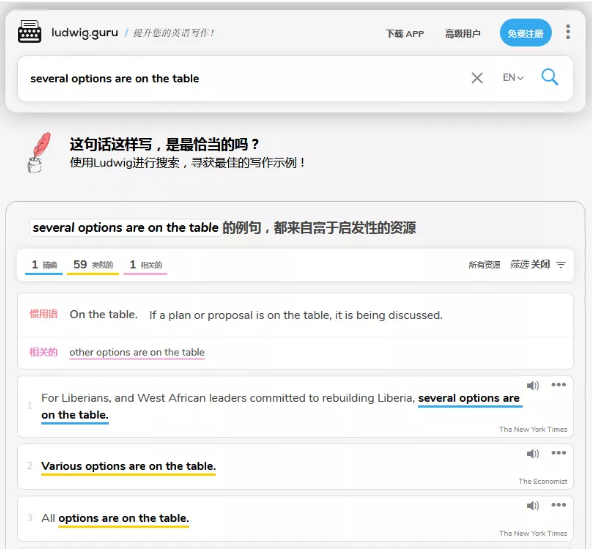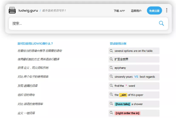 LUDWIG可以帮助我们最恰当的表述方式、对比两个句子的使用频率、找出定义同义词和事例。使用最极致的方式,用英语进行翻译哦。OMG!这个网站也太好用了吧。