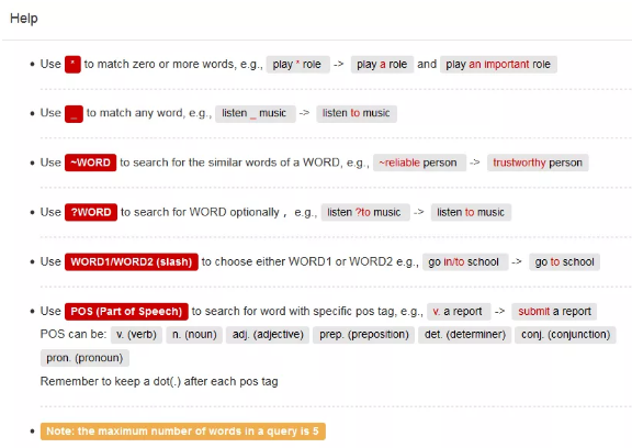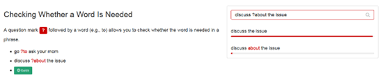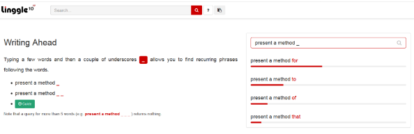 我们举个例子,比如在文中想说 present a method 那么这个后面跟什么介词呢?for, to, of 还是 that?我们只需要在搜索框中输入 present a method ___ 那么网站就会自动匹配数据库中,使用频率最多的表述。