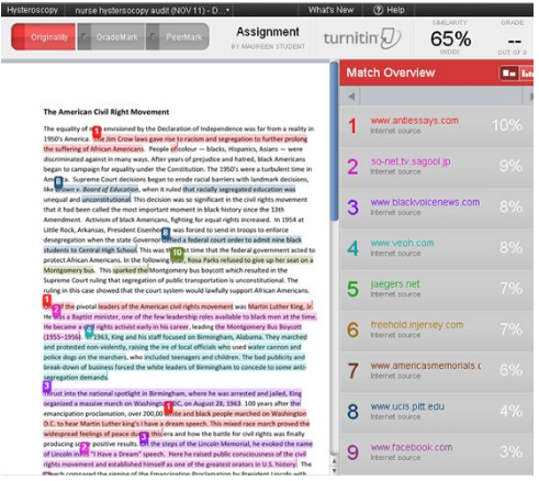这些反抄袭软件里令人闻风丧胆的就是Turnitin。它被广泛运用在英联邦的各大高校中。它的脑容量上到所有发表过的英文文献,下到在学术期刊与网页信息。甚至你自己上交过的作业都能一一找到。