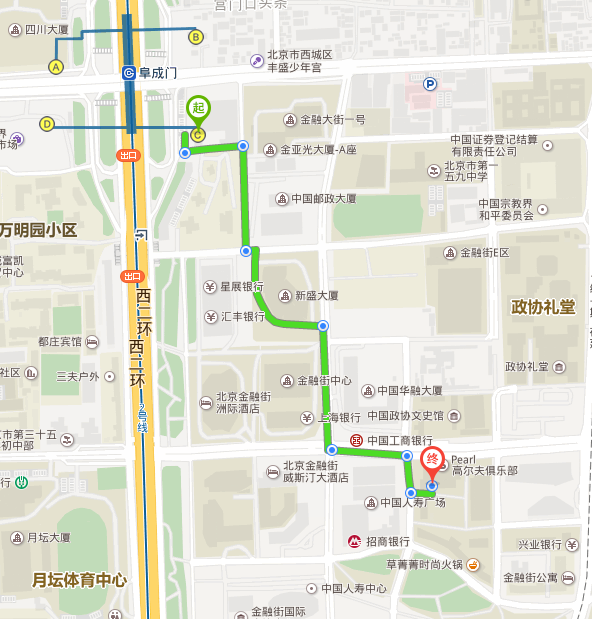 乘坐地铁2号线到阜成门下车C口出,步行800米后到达第一天比赛报道地点。