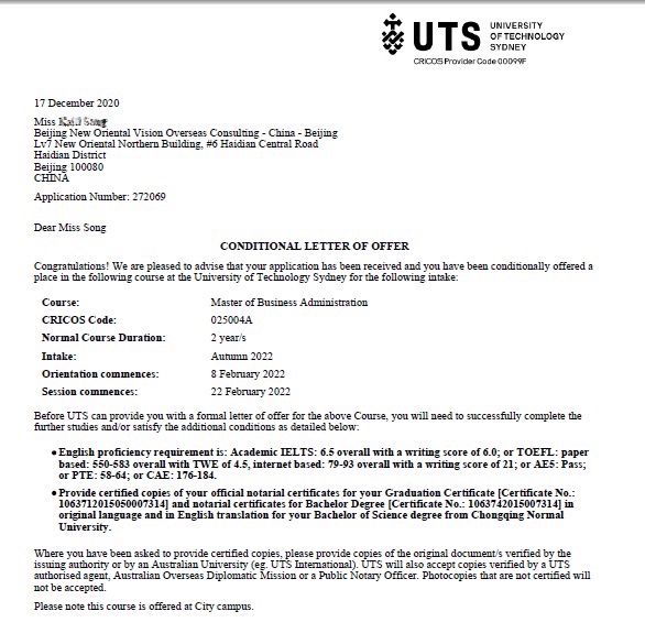 在和学生反复沟通以后,学生明确表示相比于院校综合排名更注重于专业排名,实践机会以及院校地理位置等。所以最终我们把申请的院校范围锁定在了悉尼科技大学和麦考瑞大学的MBA和市场营销专业。在确定之后我们立即帮助学生在递交申请,终于在圣诞假期之前学生拿到了自己意向最强的悉尼科技大学MBA专业的offer。