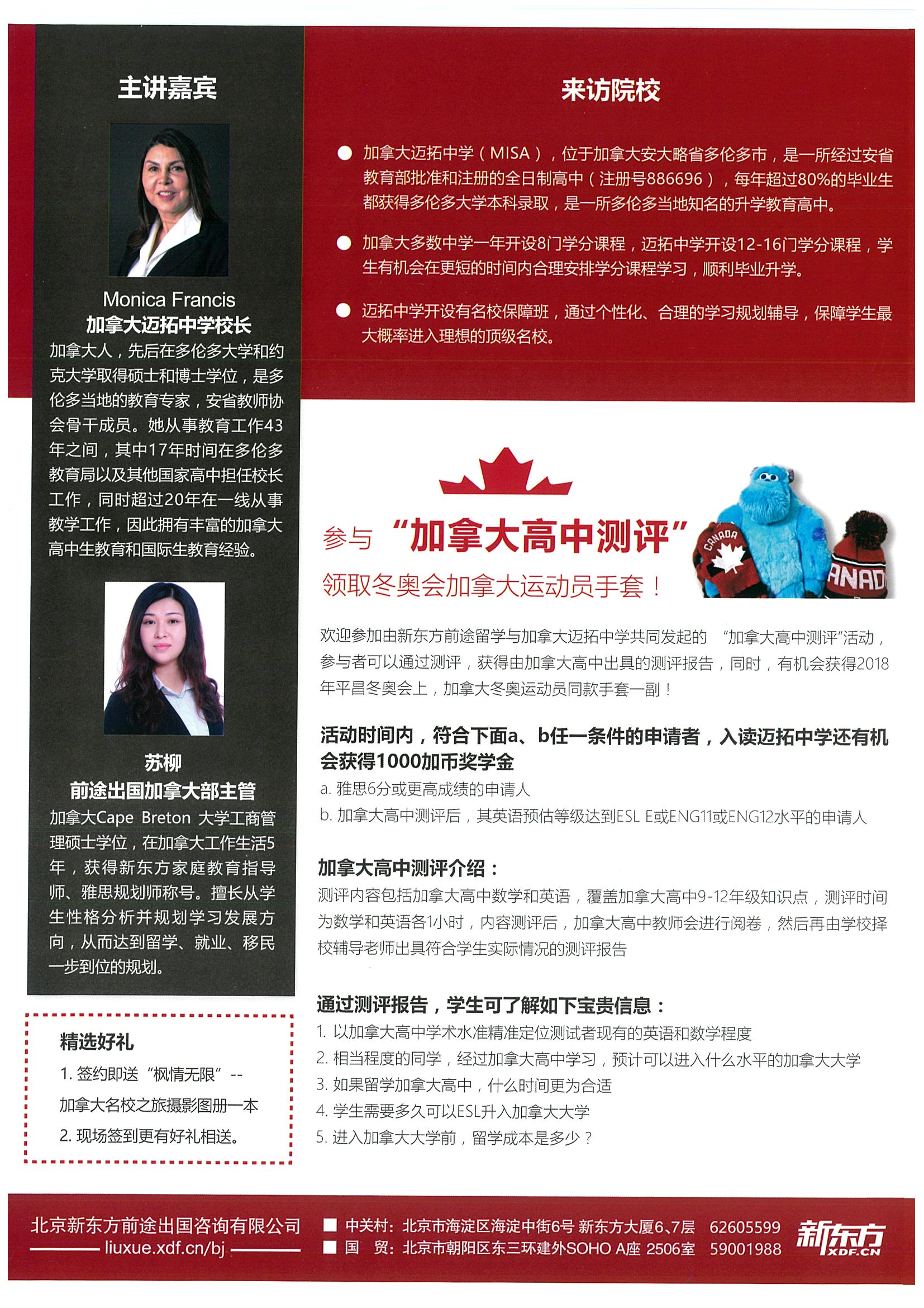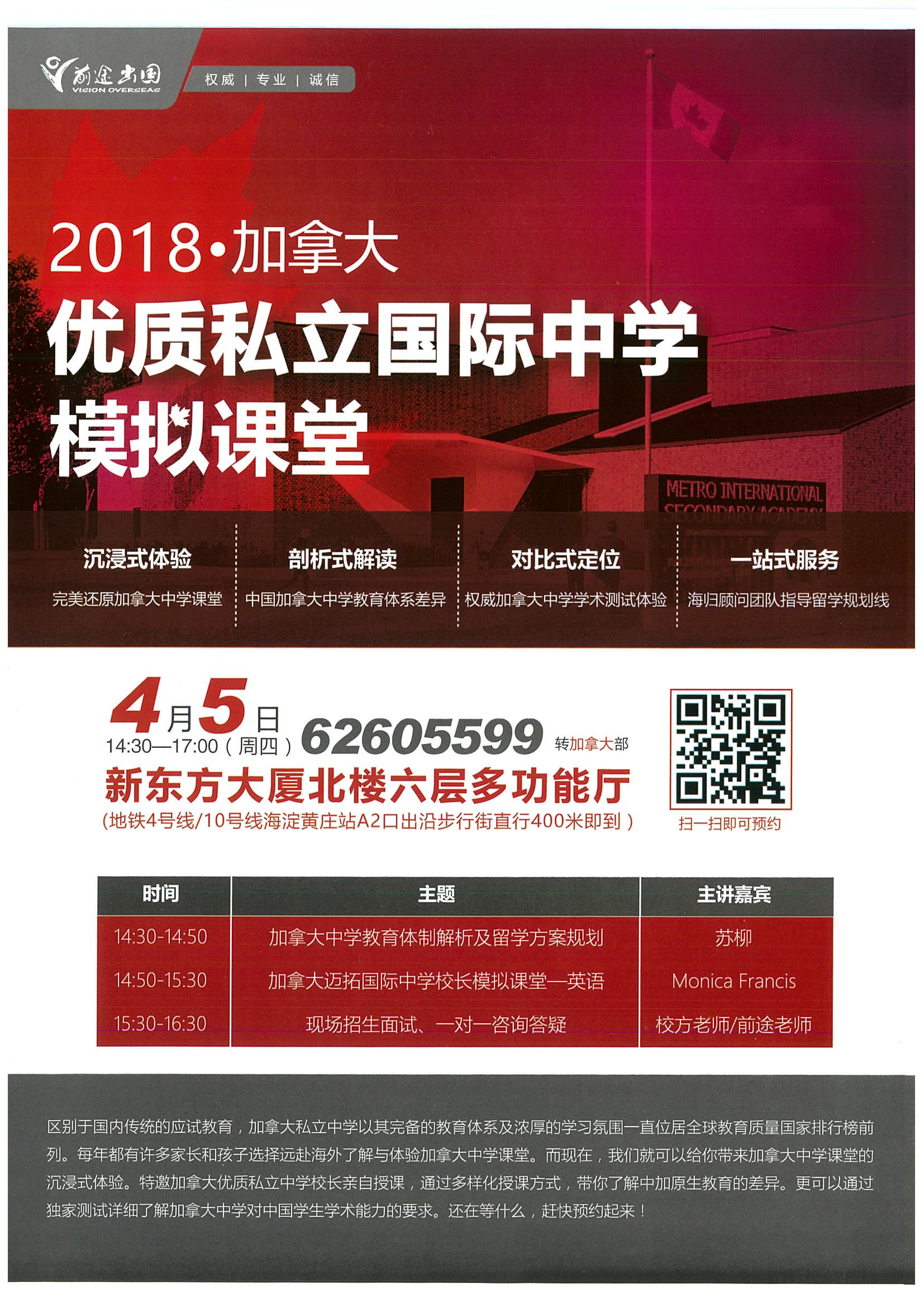 区别于国内传统的应试教育,加拿大私立中学以其完备的教育体系及弄好的学习氛围一直位居全球教育质量国家排行榜前列。每年都有许多家长和孩子选择远赴海外了解与体验加拿大中学课堂。而现在,我们就可以给你带来加拿大中学课堂的沉浸式体验。特邀加拿大优质私立中学校长亲自授课,通过多样化授课方式,带你了解中加原生教育的差异。更可以通过独家测试详细了解加拿大中学对中国学生学术能力的要求。还在等什么,赶快预约起来!