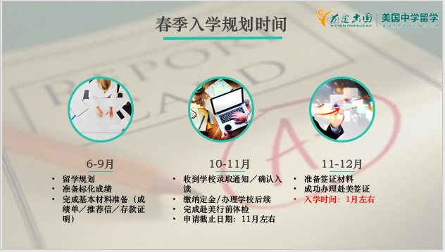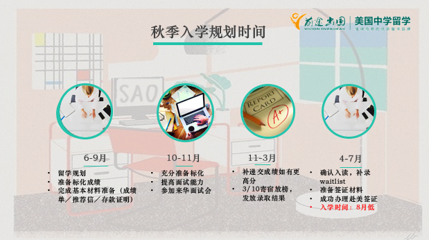 举例:由于年级较高,如果开始了高一课程,那对应的美国年级就是10年级。那如果申请正常秋季入学的话,竞争比较激烈,大学录取梦校的准备期也比较短,所以建议可以申请春季入学作为过度,以国内高一为例, 如高一期间准备申请,可以尝试申请10年级申9年级下 。