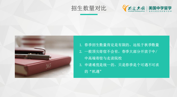 从招生数量来说,毋庸置疑,秋季招生的名额要比春季招生的名额多很多。一方面,我们可以说几乎所有的美国高中都有秋季入学,特别是一些知名院校和走读高中,而且学生能够申请的学校也更加全面。但并不是所有的高中都有春季入学。另一方面,即使学校设有春季招生,在招生数量上也是要少于秋季招生的。