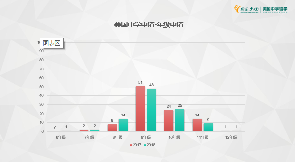 我们可以看到,从2017至2018年,9年级申请人数逐渐减少,更多的同学们开始申请8年级,这也侧面反应出留学低龄化的趋势