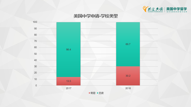 这个数据我们可以得知,寄宿学校仍然是很多家长心目中的热门,所以竞争也会逐渐增大,美国寄宿中学一向是很受到家长青睐的, 师资力量雄厚,校园设施优良,但由于寄宿中学数量有限,招收人数有限,所以竞争愈发激烈这几年。 对于准备时间比较短的话走读也是个比较不错的选择