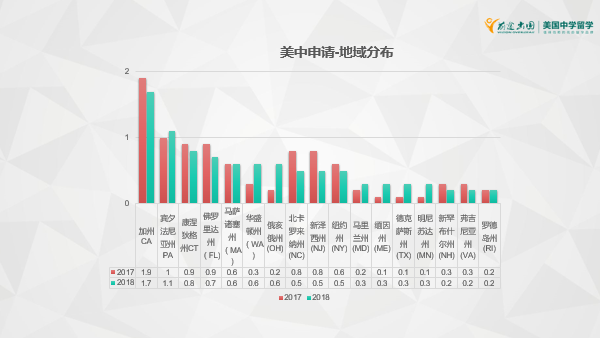 根据数据显示,加州仍然是很多家庭的首选, 但是根据数据显示,申请院校地域也扩大了,越来越多的家长考虑避开竞争特别激烈的区域,转去南部,中西部,以及五大湖区域的优质中学。