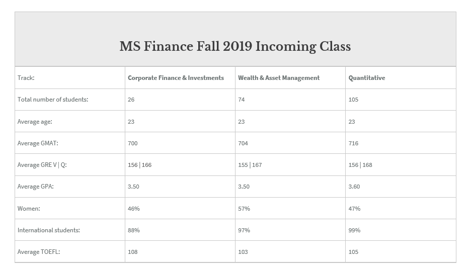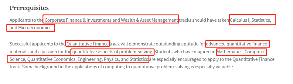 对于公司金融和财富管理这两个track来说,要求学生有修过微积分,统计,和微观经济学课程。而对于计量金融这个track来说,由于对学生的量化背景比较看重,数学,计算机,计量经济学,工科,物理和统计专业的学生,会比较占优势。