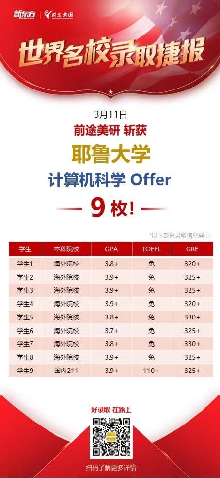 耶鲁大学计算机硕士放榜了!一天内新东方总共收获了9枚耶鲁大学CS的录取,其中有一位就是我的小Z同学。而且在这九名同学中,只有他一位非海本的学生,而且也非清北非985。在拿到录取的这一刻我们激动万分,也是不小心开创了他们本校计算机的一个先河。