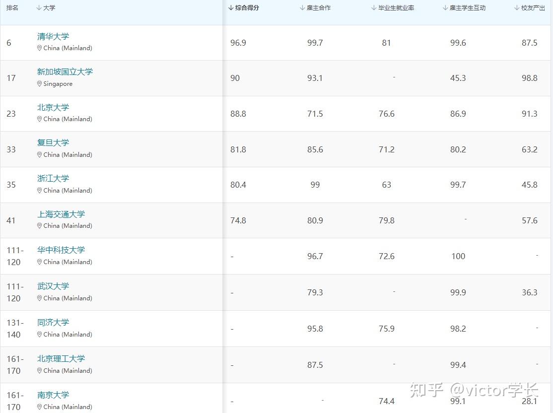 根据各类指标综合得出的就业竞争力排名中,新加坡国立大学领先,超过北大。
