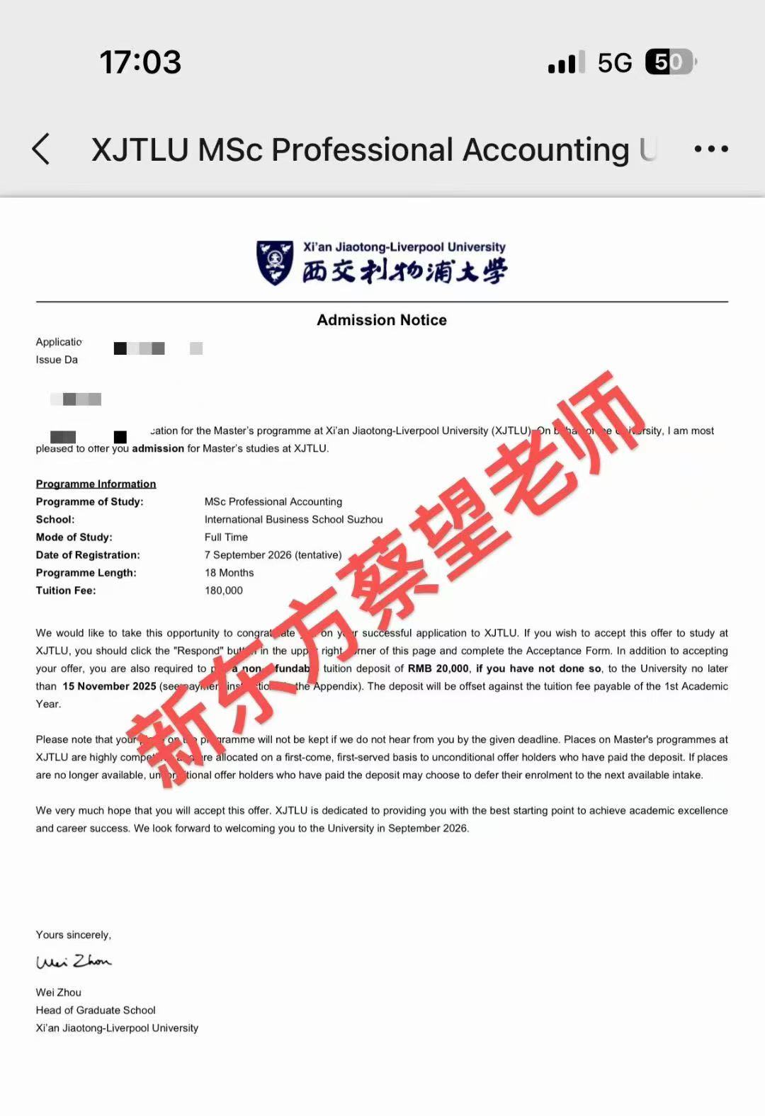 苏州科技大学,本来考研但是出分以后没考上,紧急考虑西浦研究生,但是也太晚了,学校已经位置。等待了半年,重申2026年的秋季入学,10月份顺利拿到了西浦商学院里面特别难申请的专业会计硕士~我很为他骄傲!