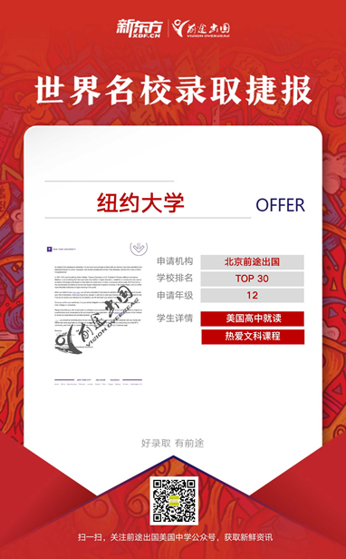 在此期间,新东方前途出国的导师们始终陪伴在同学们身边,帮助大家一一解决学业上的难题,也让许多毕业班的同学凭借优异的综合成绩与出色的学术背景,获得了top名校的青睐!今天分享的就是同学收到的纽约大学offer。