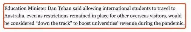 澳洲教育部长Tehan直接表示:“我们正式考虑,让留学生能够不受禁令影响,提前回到澳洲上课。”
