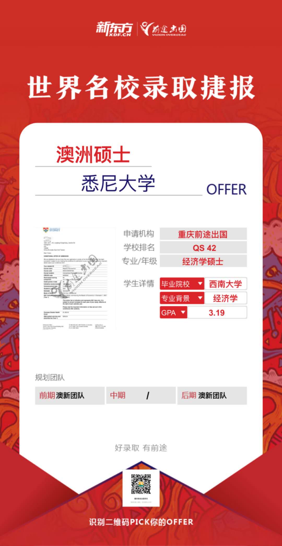 同学目前大三,本科是学校2+2项目对接的是澳大利亚的西澳大学,放弃了项目班决定直接申请研究生,自己对于学校有相关了解,很明确就想去悉尼大学,但是对于专业没有明确想法,本科是经济学,跟学生沟通之后把商科相关专业的详细介绍及就业方向跟学生分析之后还是很抉择,因为准备时间相对而言比较晚,大三上成绩出来就可以马上递交,而我们是大三下才开始了解准备,所以就把节奏给学生拉得比较快,后面建议学生选择同时申请了商学和经济学专业,悉尼大学可以同时给两个专业的录取,递交申请后拿到录取还有时间再慢慢来决定最终入读的专业, 3月19日我们准备好所有的申请材料递交申请,3月26日学校让补护照,我们联系学生第一时间补给学校之后,在4月2日顺利拿到经济学专业的录取,因为悉尼大学经济学专业是在人文社科学院,商学是在商学院,审理速度略有差异,我们先拿到了经济学的录取也算是吃了一颗定心丸,学生也很开心对于之后的雅思学习还有均分提升都更有动力。希望能早日考到合格雅思。