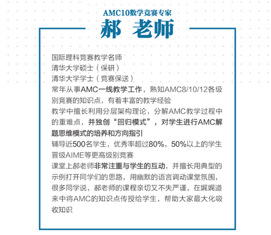 热爱数学的你是不是看完后很心动,12月5日,下周六的AMC10培训班期待你的加入,欢迎感兴趣的家长和学生与我们联系。