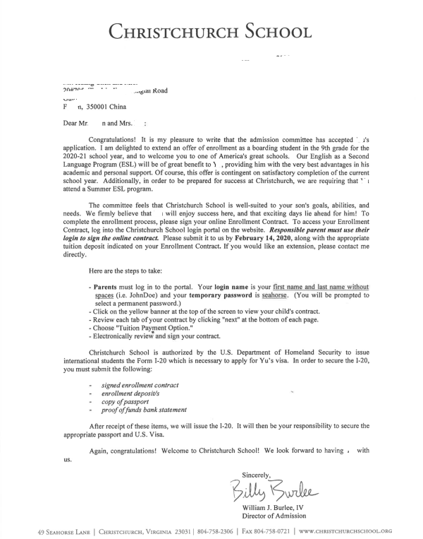 于是在8年级上进行美国高中正式申请时候就顺利成章的学生的文书素材就很丰富,学生的口语就特别的流利,对机器人的热爱活动呈现就很到位,学生最终如愿的录取到了机器人项目很不错的Christchurch School。
