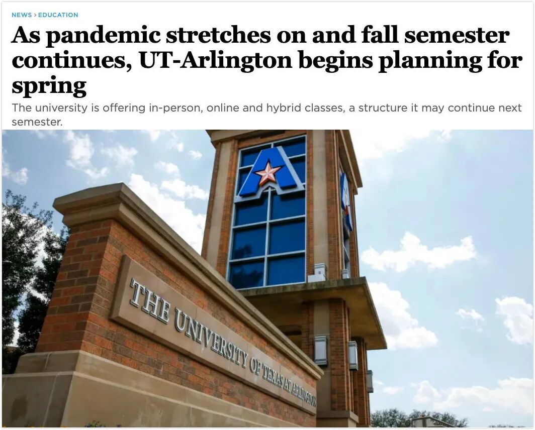 德州大学阿灵顿分校同样将在2021年春季学期为学生提供线下课、线上课、线上/线下混合授课三种教学模式,供学生选择。德州大学奥斯汀分校预计近期也将出台春季教学方案。