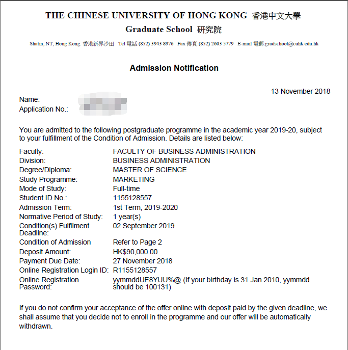 2018年11月13日,我们收到了香港中文大学—市场学的录取!
