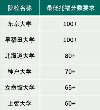 日本普通的国公立院校要求学生的托福成绩在70-80分左右,而重点的国立大学如东京大学,京都大学以及私立大学如早稻田大学,庆应大学要求都在90分以上,读大学院要求在100分左右。