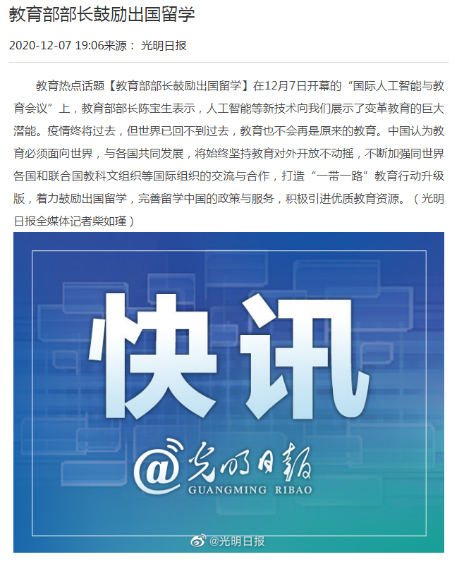 相信在12月7日开幕的“国际人工智能与教育会议”上,教育部部长陈宝生鼓励出国留学的发言对于正在准备留学或是已在留学路上的同学无疑是一种强有力的鼓舞和支持,这说明面向世界的教育已是大势所趋。
