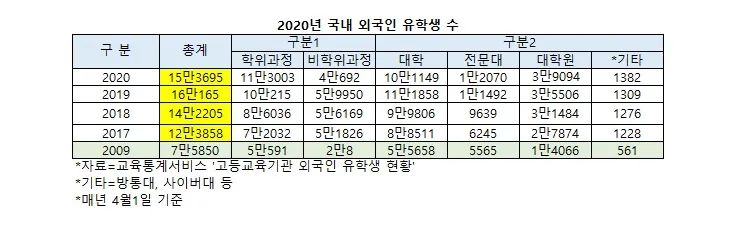 外国留学生2000名以上的学校有庆熙大学、成均馆大学(3576名)、高丽大学(3135名)、延世大学(2684名)、中央大学(2461名)、汉阳大学(2409名)、韩国外国语大学(2267名)、又松大学(2170名)、国民大学(2167名)、西江大学(2094名)、仁川大学(2070名)、祥明大学(2023名)等高校。