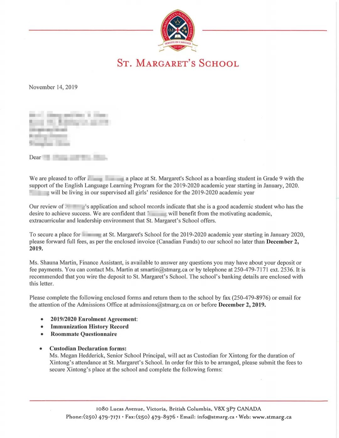 在经过了一个阶段的培训之后,该同学也等来了加拿大BC省一流私立贵族中学圣玛格丽特中学(SMS)的面试通知。在面试的当天上午,老师们又强化的进行了一次中教和一次外教面试辅导,学生特别自信了面对非常nice的面试官,顺利的完成了近20分钟左右的面试。