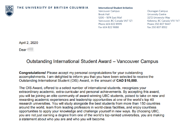 暨收到麦克马斯特大学的录取以后,在2020年2月份,收到了加拿大TOP名校英属哥伦比亚大学UBC的计算机专业的录取,众所周知,英属哥伦比亚大学UBC全球排名前50,是一所非常优秀同时非常难申请的大学,学生和家长知道消息以后,非常开心。在今年2月份收到加拿大TOP名校UBC大学的录取后,大学在2020年4月给学生追加了10000加元的奖学金。