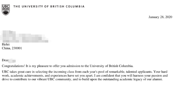 但是由于咱们这位学生已经高三,并没有太多的时间去准备到竞赛(建议想冲击名校的孩子高二开始准备竞赛活动),所以在申请准备阶段,咱们的申请老师团队针对学生进行了深入挖掘——为什么要申请计算机专业、对于计算机专业的感悟、校园活动等等,全方位的在文书方面为学生增添录取把握。最终,学生在去年的12月拿到了麦克马斯特大学--计算机专业的录取。学生和家长都非常开心,麦克马斯特大学的理工科,全球排名非常高。暨收到麦克马斯特大学的录取以后,在2020年2月份,收到了加拿大TOP名校英属哥伦比亚大学UBC的计算机专业的录取,众所周知,英属哥伦比亚大学UBC全球排名前50,是一所非常优秀同时非常难申请的大学,学生和家长知道消息以后,非常开心,圆了名校梦。