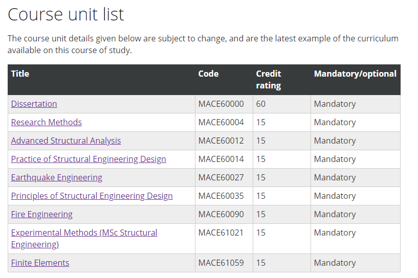 曼彻斯特大学(The University of Manchester),是英国大学中世界排名最高的八大最著名学府之一,世界50强名校,英国著名的六所“红砖大学”之首,英国“常春藤联盟”罗素大学集团的创始成员之一,始建于1824年,是英国最大的单一校址大学。曼彻斯特大学结构工程理学硕士项目由八个课程单元(每单元15学分)和研究论文(60学分)组成,课程由国际领先研究人员和工程师教授,提供了实验操作和研究方法的导论,涵盖了结构、钢结构和混凝土结构及有限元建模的动静态特性相关的高级理论和设计原理。该项目的独特性在于,研究了极端环境(如火灾和地震)中的行为和设计。曼彻斯特大学土木工程学院作为跨学科学院,教员都是广泛研究领域的学术专家,拥有丰富的产业经验
