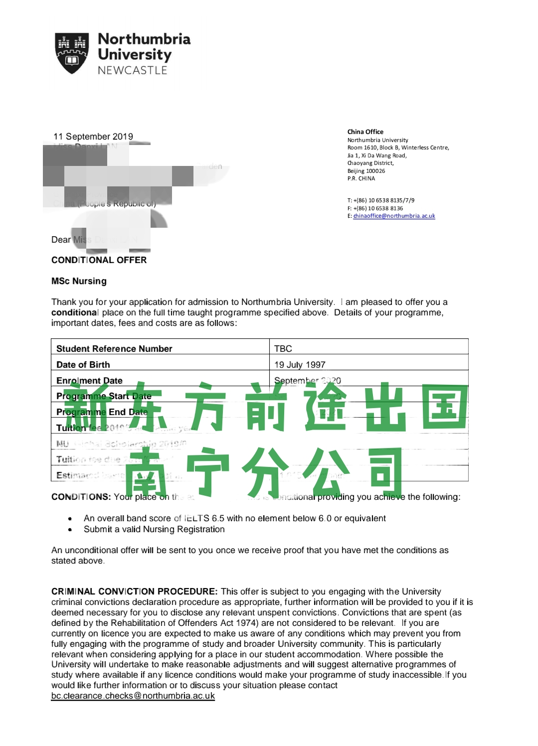 英国诺森比亚大学迄今已有150多年的历史。坐落于英格兰纽卡斯尔市中心泰恩河畔,大学规模现居英国大学第三位,拥有艺术、设计与社科学部(ADSS)、环境与工程学部(E&E)、商法学部(B&L)、健康与生命科学学部(HLS),教职员工2,000多人,35,000名在校学生。每年吸引来自至少80多个国家和地区的3,000多名留学生,中国学生占国际学生人数的六分之一。被“国家学生调查统计”评为英国最受学生欢迎的十所大学之一,2019年《卫报》全英大学排名位列前48名。诺森比亚大学在继续深造学习、持续就业排名第一。(纵向教育研究(LEO)2007)。大学一直尽最大努力保证国际学生有一个丰富多彩的学习生活。无论在教学质量的提高,学生住宿条件的改善,国际学生的指导,图书馆资源(全英排名第二)的完善和学习设施更新改建上,诺森比亚大学都竭尽全力为学生提供最棒的学生服务(诺大Student Services被评为全英排名第一)。