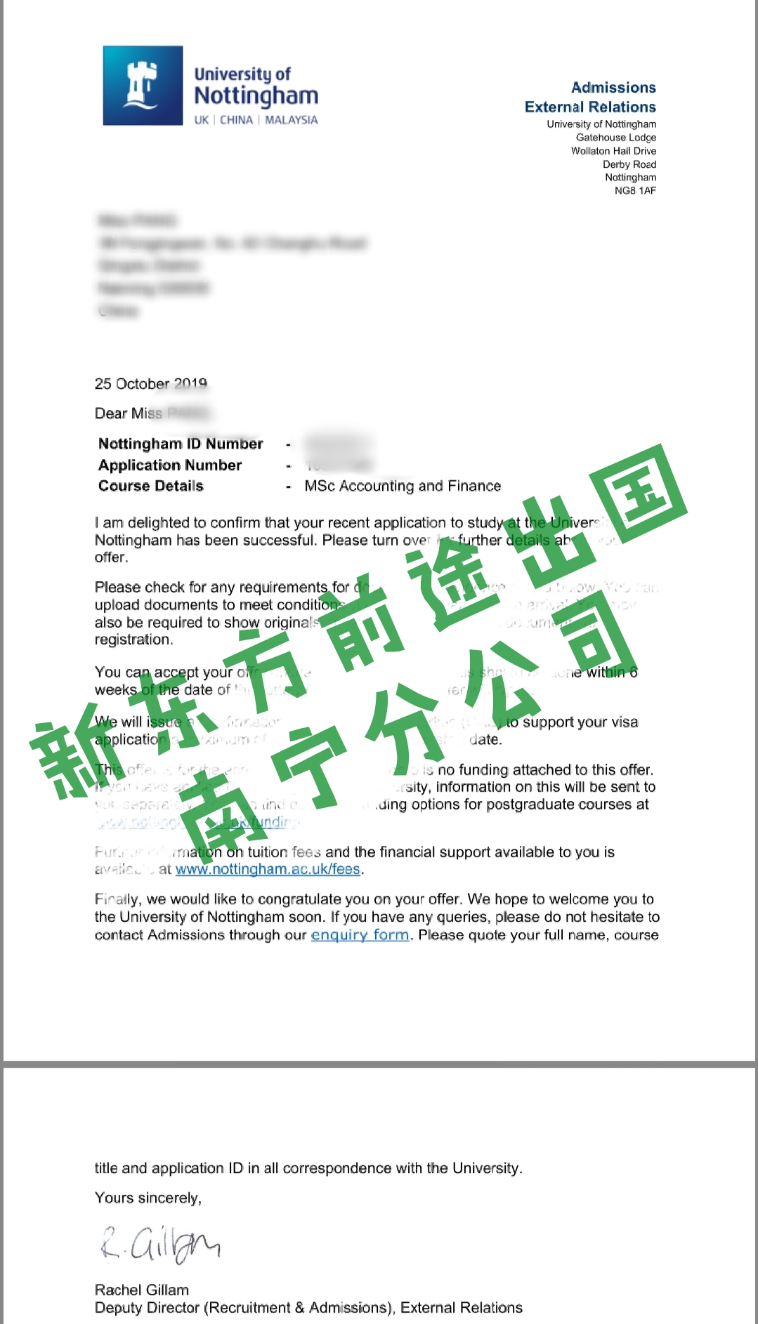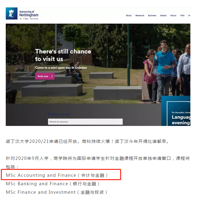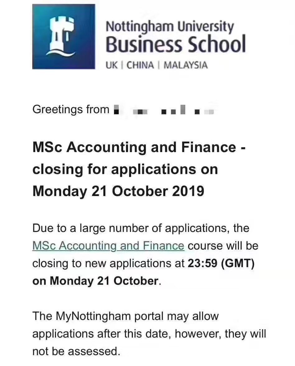 由于诺丁汉大学商学院会计和金融专业硕士申请量过大,已于2019年10月21日晚上11点59分截止申请,也就是说原定计划的11月15日已被提前。好在某同学提早规划积极配合准备申请材料,我们在9月26日就将申请递交出去,并在10月25日不到一个月的时间内就拿下offer。