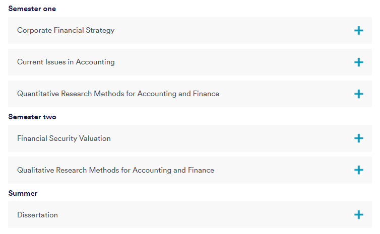 课程设置:会计与金融硕士项目共需要完成120个学分,分两个学期,具体如下