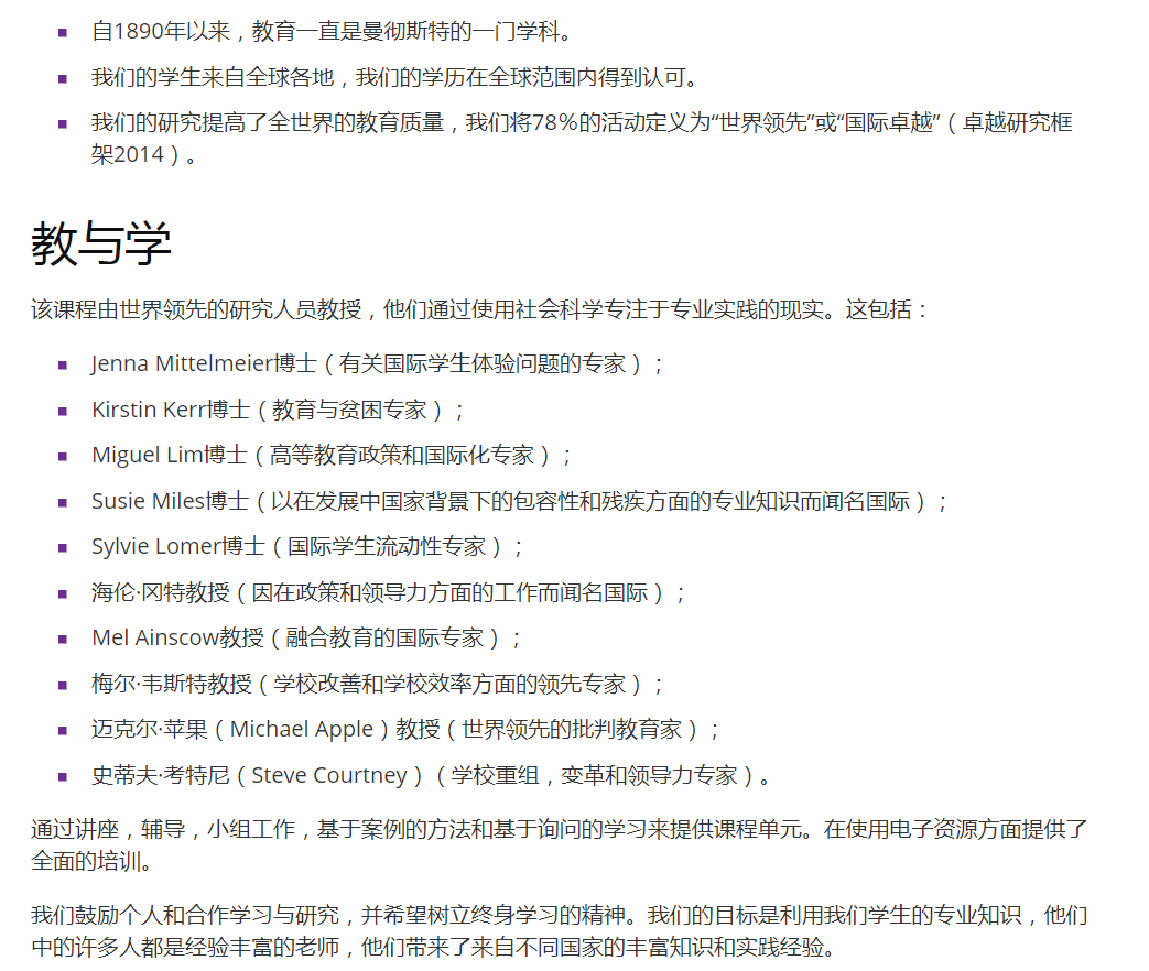 曼彻斯特大学教育学(国际)文学硕士项目强调对教育理论和理念及其应用进行结构化研究与反思,重视实践能力的培养,致力于为教师或其他教育领域的人士提供专业发展的机会与平台,以满足其职业发展的需求。该项目师资力量强大,课程由国际知名的研究专家讲授,且学生也来自全球各地,有利于接触到多样化的教育理念,拓展自己的专业视野。