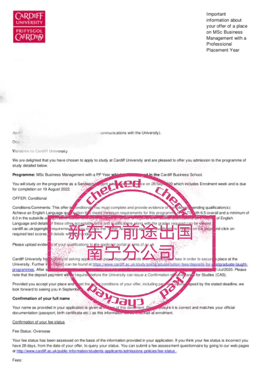 学生找到我们的时候, 已是3月下旬。学生最刚开始计划只申请商科方向, 但是此时好多院校的商科专业, 已陆陆续续关闭了申请。时间紧迫, 好在学生配合度也很高, 用了不到3天的时间,团队老师层层筛选还未截止的专业与院校, 最终与学生把院校敲定下来。1周之内定校,3周之内把材料备齐,并尽快投递申请:后期老师用了一周的时间, 完成文书与投递。由于学生本身就是国际商务管理专业的商科背景,后期老师不断与学生沟通交流,挖掘了学生在校内和毕业后的生活实践经历,通过对这些经历的整合,不断挖掘出与申请方向相匹配的点,学生发展的潜力等,最终完成文书, 帮助学生拿到卡迪夫大学的录取。