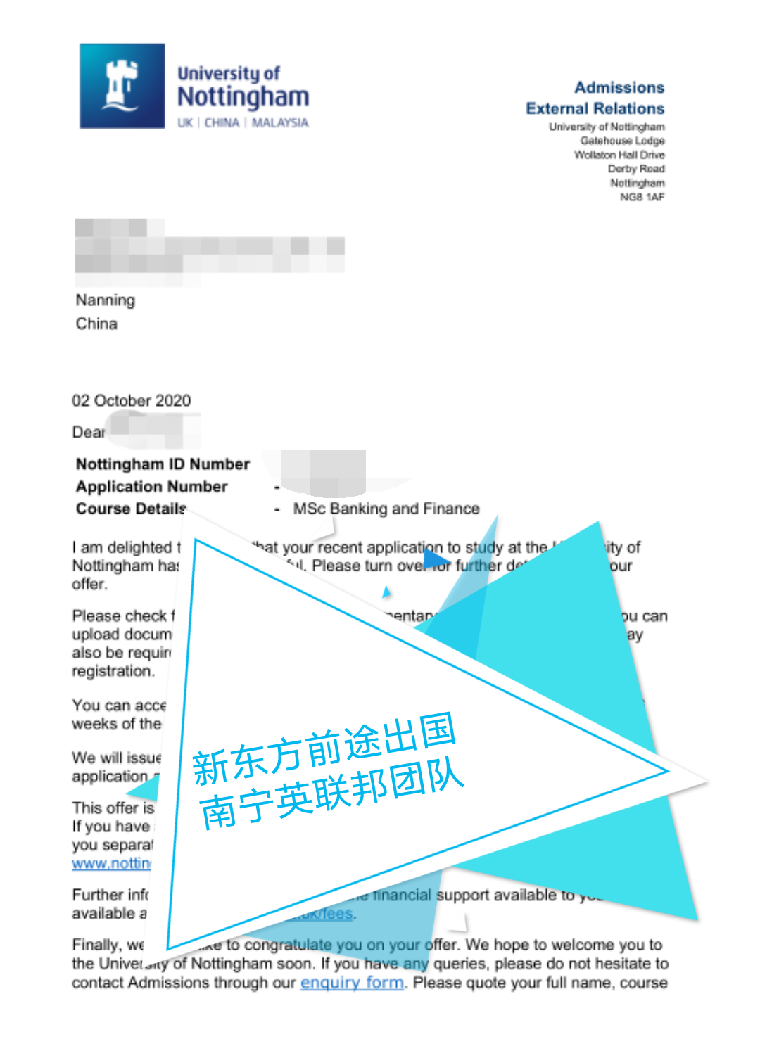 学校会根据你的材料完整性,文书符合性去审核你的申请。如果有一个大牛的推荐,或者是更加专业的文书,也是能提高你的成功率。该学生很早就委托我们新东方签约办理了,文书打磨了将近1个多月,得到诺丁汉大学的早录取offer也是意料之中。