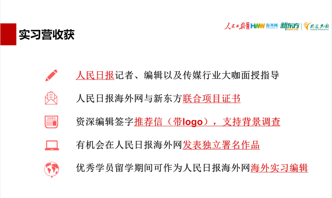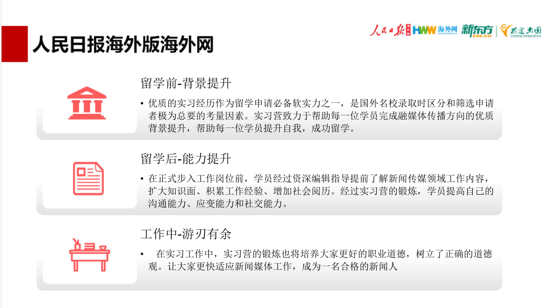 除此之外,某同学还有四段在传媒行业相关实习的经历,在经历的建议上,她个人偏向于做一些跟数字媒体相关的工作,于是在大三暑假,报名了新东方官方合作的人民日报实习更能助力申请,最后也达成了共识,顺利拿到了人民日报的实习推荐信。之后也增加了多段实习经历,让她在文书材料中形成了一个合格的传媒专业研究生申请者形象,足够让招生官眼前一亮。