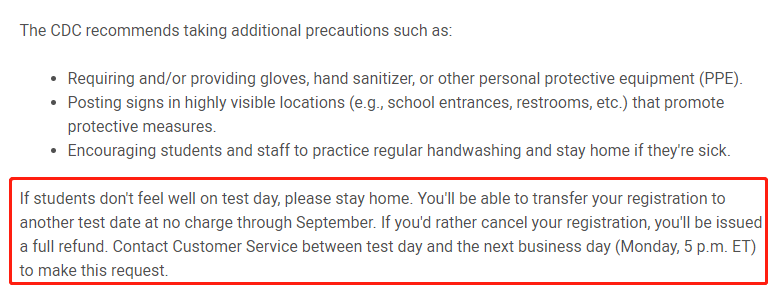 “如果学生在考试当天感觉不适,请在家休息。同时,在9月内,转考任何一场SAT考试均不会收取转考费。如果考生确实需要取消已注册的考试,请在考试后的第一个工作日拨打客服热线进行申请,申请成功后考试费将全额退回。”