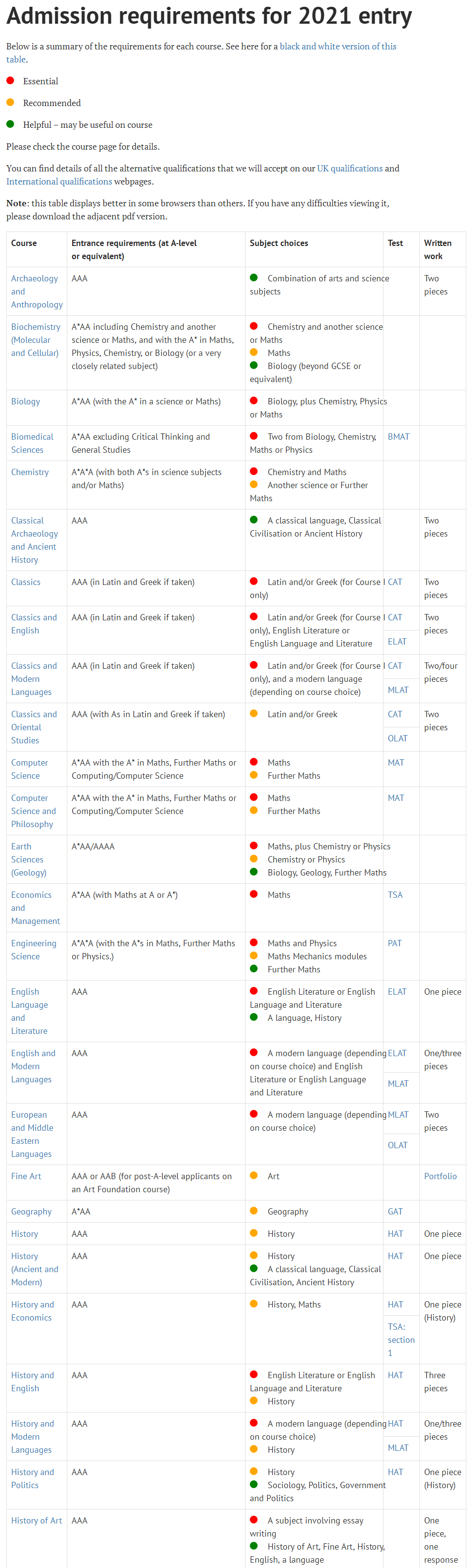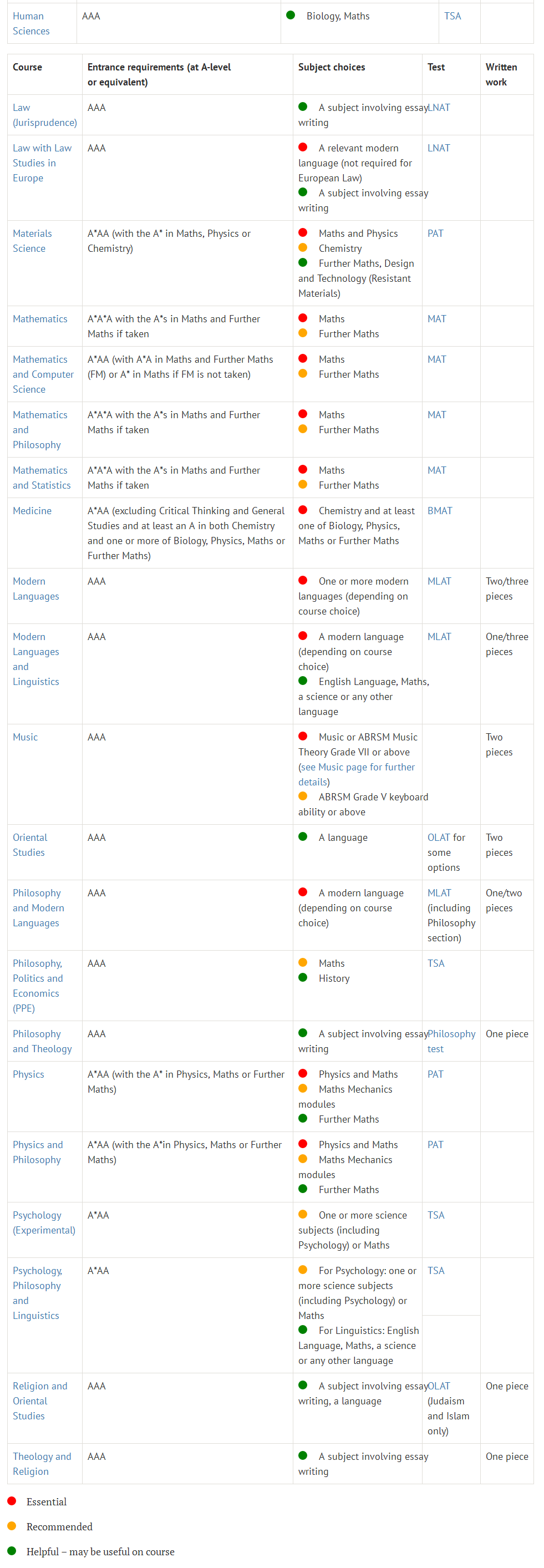 首先,学生可以在选课前先去将来有意申请的高校官网查下,一般学校都会列出各专业对A-Level成绩及科目的要求,以牛津大学为例,2021牛津本科入学各专业A-level成绩要求和选课建议如下(数据来源于官网):