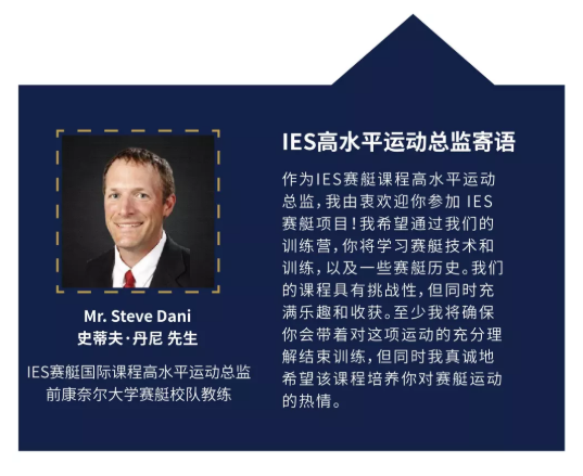 运动与教育结合、专业与趣味并存是“IES运动精英计划青少年赛艇训练营”独特的魅力所在。训练营由拥有20余年执教经验的前康奈尔大学教练Steve Dani亲身指导,辅以国内赛艇运动员配合执教,通过训练营的学习,学生在逐步提升运动表现水平及综合竞争力的同时,也能更清晰的了解美国赛艇升学体系,及早的接受名校文化的熏陶。