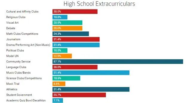 除了学习,他们还有丰富的课外活动,并且许多人担任领导职务,且不止一个。最受欢迎的高中课外活动包括社区服务(87.1%),运动(51.4%)。最后,79% 的新生压力来自自我期望,而且26.3%做过心理咨询。