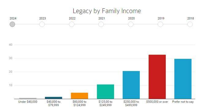 父母中有一人或多人读过哈佛大学的学生,其父母收入水平平均高于家里没有哈佛校友的学生。校友子女新生中有32.58%的家庭收入达到50万美元以上(即美国人定义的“富豪家庭”门槛),其实这已经算低的了,毕竟还有29.55%的不愿透漏。