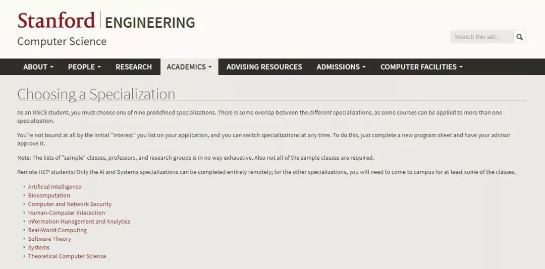 斯坦福大学计算机专业分类:人工智能,生物计算,计算机与网络安全,人机交互,信息管理与分析,现实计算,软件理论,系统,以及理论性计算机科学。 https://cs.stanford.edu/academics/masters/choosing-specialization
