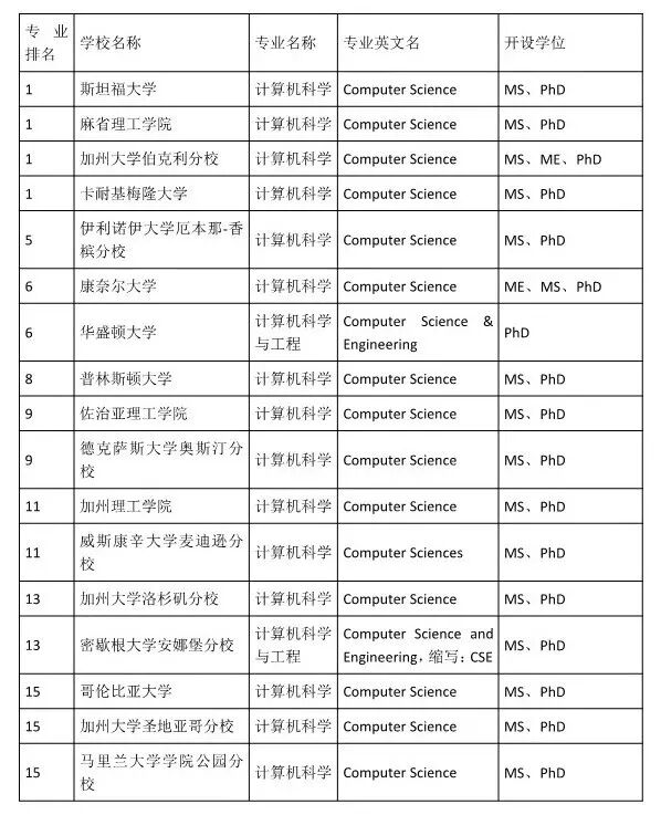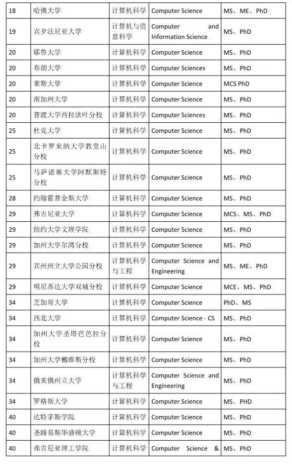 US NEWS 2020年的计算机专业排名如下(前40排名):