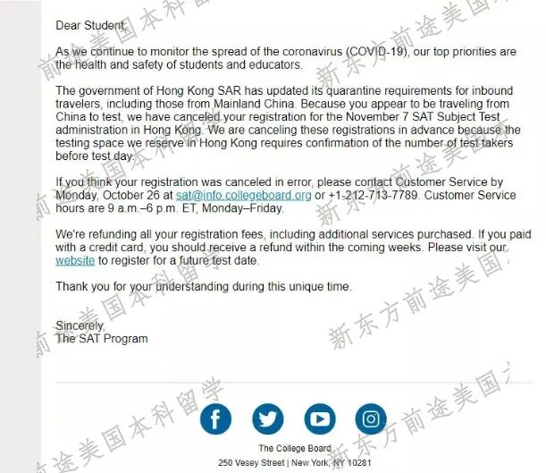 而这次CB官方的正式邮件也可能算是正式宣告:11月SAT2&12月SAT大陆同学想去香港考试的计划预计不可行。