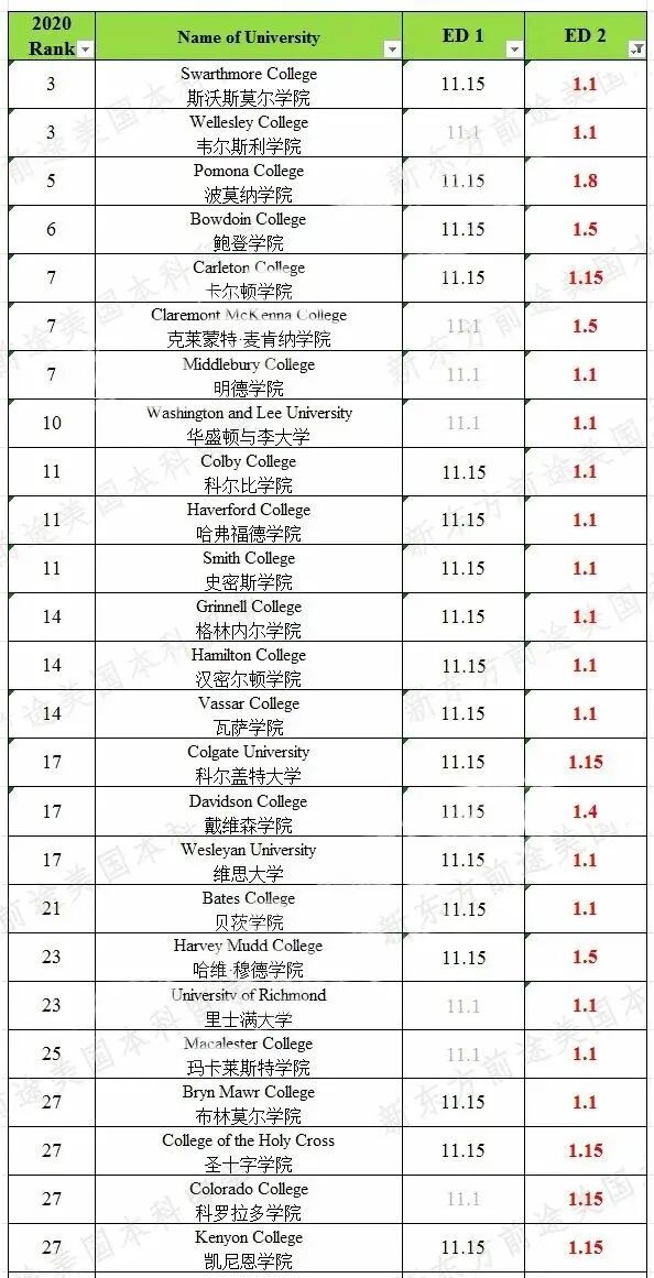 大部分文理学院都会同时开设ED1和ED2,前30中就有25所学校提供ED2申请批次。