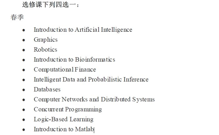 计算机科学专业的学生必须学完所有核心课程和5个选修课程,学制为一年,12个月,10月开始上课。以下是根据当前入学的年份来制定,可根据具体入学的年份调整。