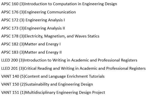 2、 Vantage One—Bachelor of Applied Science 课程如下图所示,毕业要求:完成所有课程,成绩不低于60%,未来衔接项目Okanagan Campus:Electrical,Mechanical,and Civil Engineering;Vancouver Campus: Chemical, Chemical and Biological,Computer,Electrical,Environmental, Geological,Integrated, Materials, and Mining Engineering.