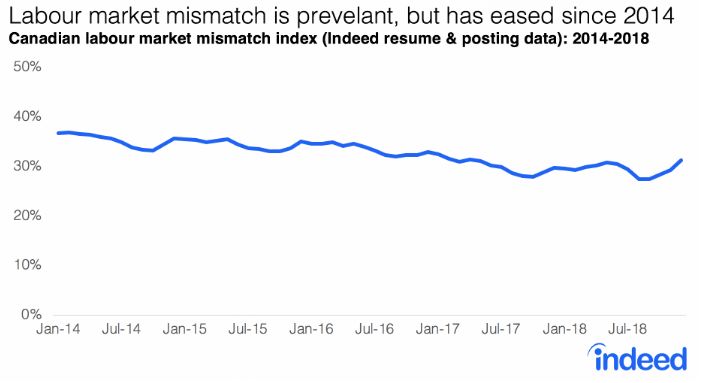 不过分析还发现,近年来不匹配的情况有所减少,在2014年12月至2018年12月间缓解了12%。大部分下降发生在2017年,这是就业增长的标志性年份。在同一时期,加拿大央行商业前景调查中报告劳动力短缺的雇主比例从22%上升至37%。