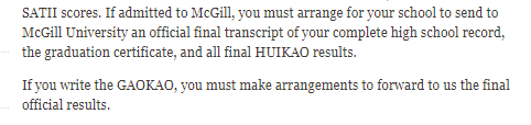 中国高考如千军万马过独木桥,12年寒窗苦读,加拿大懂你们,所以普高生们不用SAT也不用ACT,用你们的高考成绩就可以了。