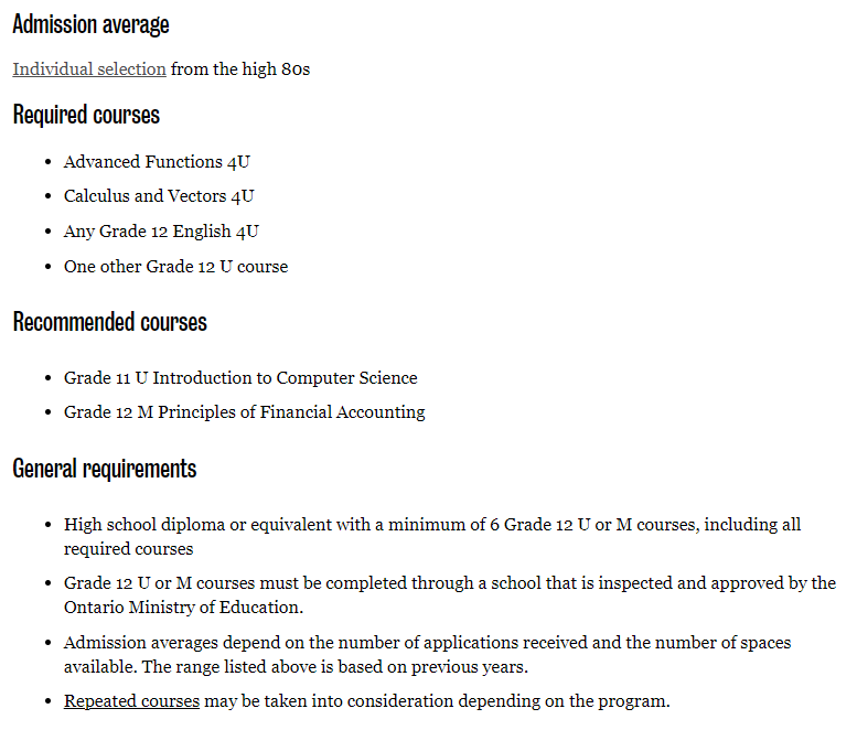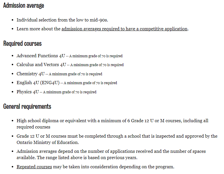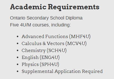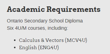 至少6门学术或非学术12年级课程(推荐,不是必须),12年级需要包括ENG4U、MHF4U、SCH4U、SPH4U(鼓励没有学习SCH4U或SPH4U或类似课程的出色申请者申请,并将根据具体情况进行审查)